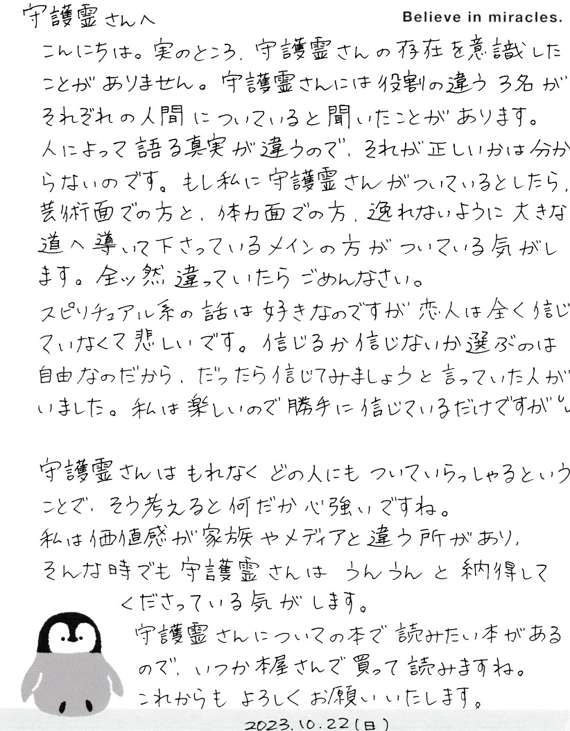 こんにちは。実のところ、守護霊さんの存在を意識したことがありません。守護霊さんには役割が違う3名のがそれぞれの人間についていると聞いたことがあります。