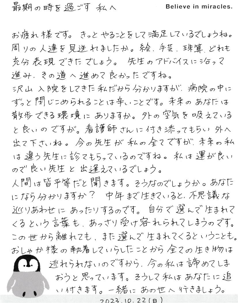 沢山入院をしてきた私だから分かりますが、病院の中にずっと閉じこめられることは辛いことです。未来のあなたは散歩できる環境にありますか。外の空気を吸えていると良いのですが。看護師さんに付き添ってもらい 外へ出て下さいね。今の先生が私の全てですが、未来の私は違う先生に診てもらっているのですね。