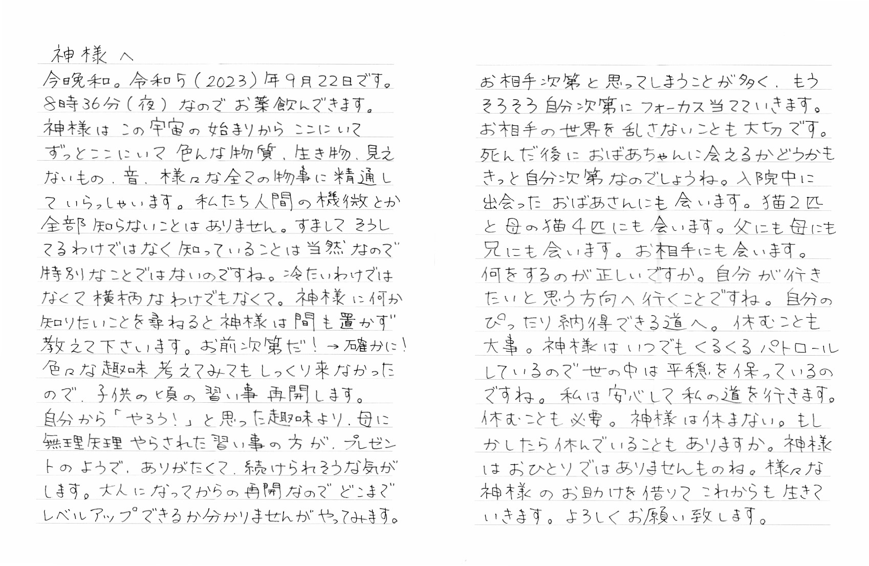 8時36分(夜)なのでお薬を飲んできます。神様はこの宇宙の始まりからここにいて、ずっとここにいて色んな物質、生き物、見えないもの、音、様々な全ての物事に精通していらっしゃいます。私たち人間の機微とか全部知らないことはありません。