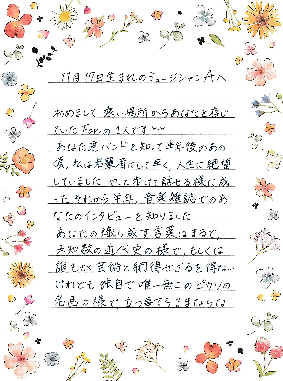 あなたの織り成す言葉はまるで、未知数の近代史の様で、もしくは誰もが芸術と納得せざるを得ないけれども独自で唯一無二のピカソの名画の様で、立つ事すらままならなかった私の心の松葉杖と成ってゆきました