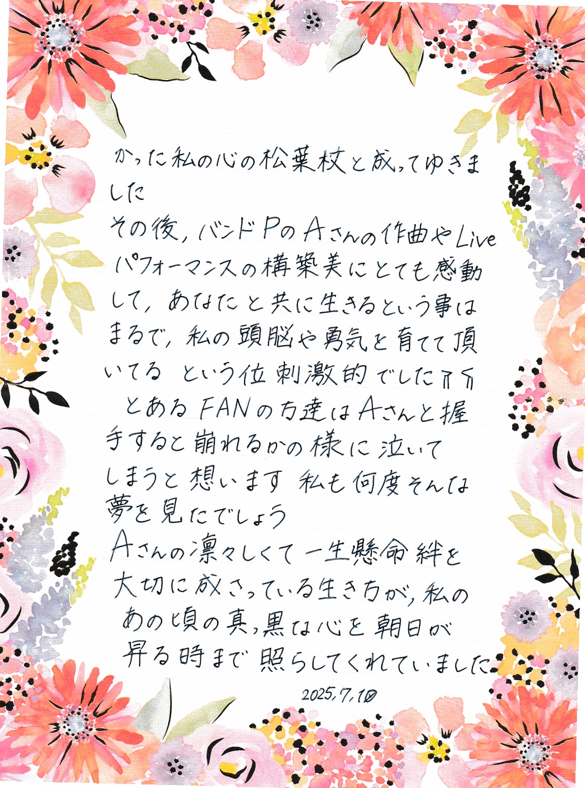 その後、バンドPのAさんの作曲やLiveパフォーマンスの構築美にとても感動して、あなたと共に生きるという事はまるで、私の頭脳や勇気と育てて頂いているという位刺激的でした。