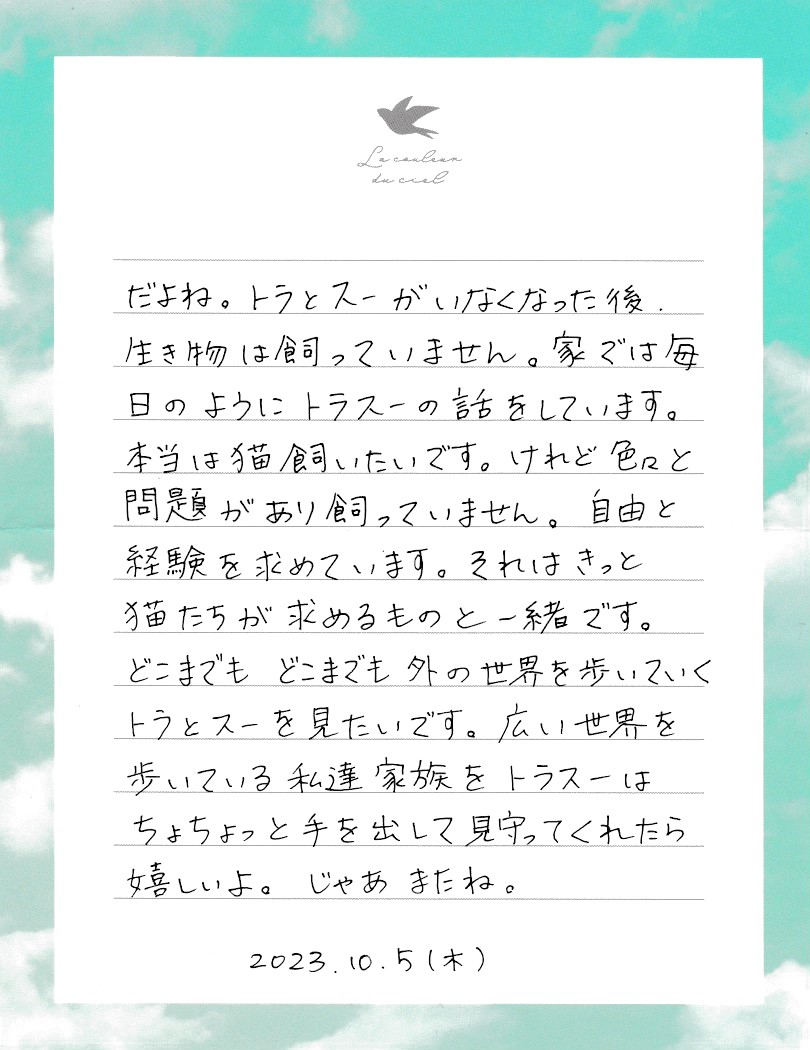 トラとスーがいなくなった後、生き物は飼っていません。家では毎日のようにトラスーの話をしています。本当は猫 飼いたいです。けれど色々と問題があり飼っていません。自由と経験を求めています。それはきっと猫たちが求めるものと一緒です。