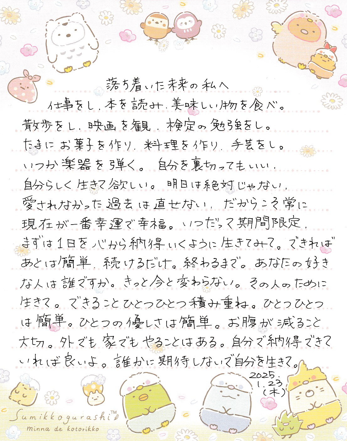 仕事をし、本を読み、美味しい物を食べ、散歩をし、映画を観て、検定の勉強をし。たまにお菓子を作り、料理を作り、手芸をし、いつか楽器を弾く。自分を裏切ってもいい。自分らしく生きて欲しい。明日は絶対じゃない、愛されなかった過去は直せない、だからこそ常に現在が一番幸運で幸福。いつだって期間限定。