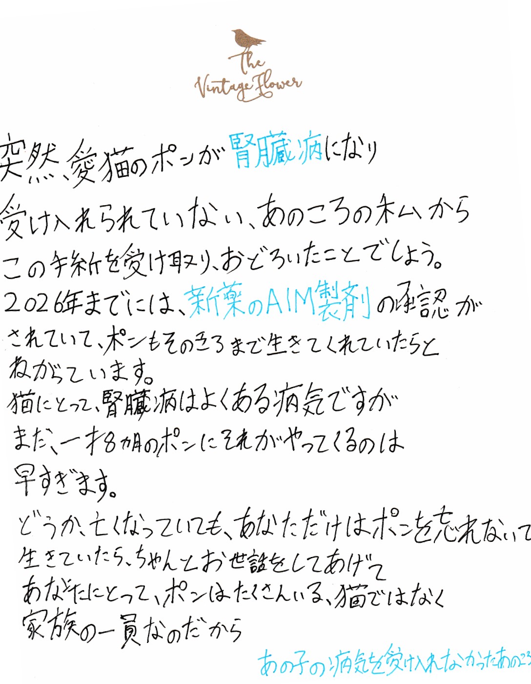 突然、愛猫のポンが腎臓病になり受け入れられていない、あのころの私からこの手紙を受け取り、おどろいたことでしょう。2026年までには、新薬のAIM製剤の承認がされていて、ポンもそのころまで生きてくれていたらとねがっています。